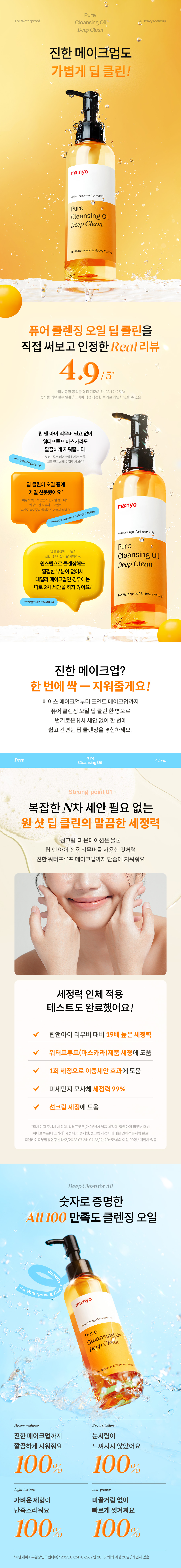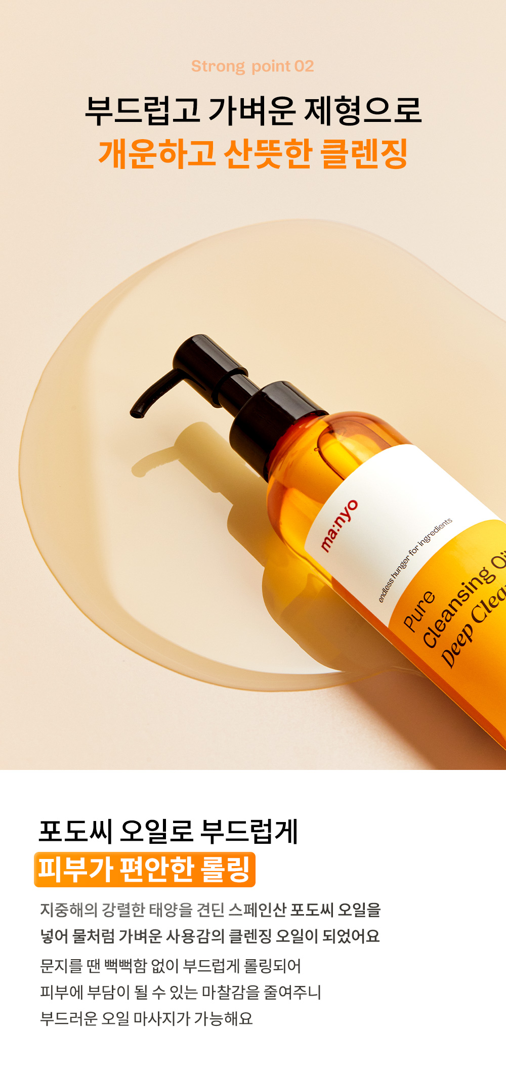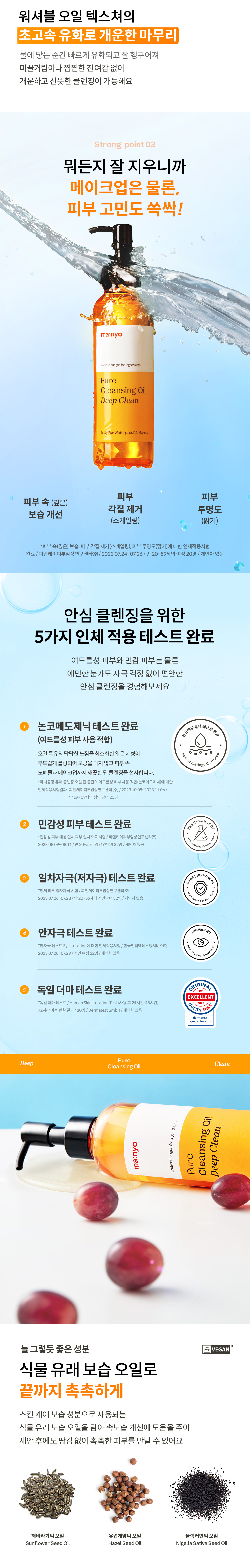 | 사용방법 | 적당량을 덜어 마른 얼굴 전체에 펴 발라 부드럽게 마사지한 후 손에 약간의 물을 묻혀 30초 정도 다시 마사지(오일이 우윳빛으로 변하는 유화 과정)하여 미온수로 깨끗이 헹구어 냅니다. TIP. 화장솜 또는 면봉에 내용물을 적셔 눈과 입술 주위를 부드럽게 닦아내면 짙은 메이크업도 깔끔하게 지울 수 있어요. | ||